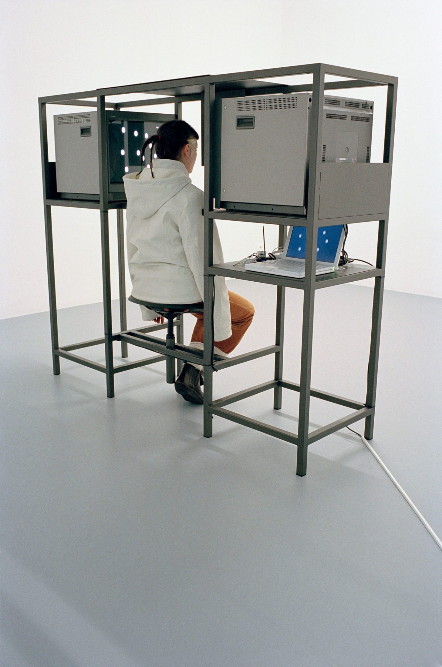 The Elevator, 2004153 x 182 x 52 cmpowder coated steel structure, two TV monitors, 1 mac mini, 1 speed adjusting knob, swivel chair